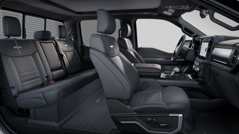 Equipped with Equipment Group 702A High, 4-Wheel Disc Brakes, 8 Speakers, ABS brakes, Adjustable pedals, Air Conditioning, Alloy wheels, AM/FM radio: SiriusXM with 360L, Auto High-beam Headlights, Auto tilt-away steering wheel, Auto-dimming door mirrors, Auto-dimming Rear-View mirror, Automatic temperature control, Brake assist, Bumpers: body-color, Compass, Delay-off headlights, Driver door bin, Driver vanity mirror, Dual front impact airbags, Dual front side impact airbags, Electronic Stability Control, Emergency communication system: SYNC 4 911 Assist, Front anti-roll bar, Front Bucket Seats, Front Center Armrest, Front dual zone A/C, Front fog lights, Front License Plate Bracket, Front reading lights, Front wheel independent suspension, Fully automatic headlights, Garage door transmitter, Heated door mirrors, Heated front seats, Heated rear seats, Heated steering wheel, Illuminated entry, Internet access capable: FordPass Connect 5G, Leather steering wheel, Low tire pressure warning, Memory seat, Navigation system: Connected Navigation, Occupant sensing airbag, Outside temperature display, Overhead airbag, Overhead console, Panic alarm, Passenger door bin, Passenger vanity mirror, Pedal memory, Power door mirrors, Power driver seat, Power passenger seat, Power steering, Power windows, Radio data system, Radio: B&O Sound System by Bang & Olufsen, Rain sensing wipers, Rear reading lights, Rear seat center armrest, Rear step bumper, Rear window defroster, Remote keyless entry, Security system, Speed control, Split folding rear seat, Steering wheel memory, Steering wheel mounted audio controls, SYNC 4 w/Enhanced Voice Recognition, Tachometer, Telescoping steering wheel, Tilt steering wheel, Traction control, Trip computer, Turn signal indicator mirrors, Unique Multi-Contour Leather Bucket Seats, Variably intermittent wipers, Ventilated front seats, Voltmeter, and Wheels: 20 Painted Gloss Ebony Black.