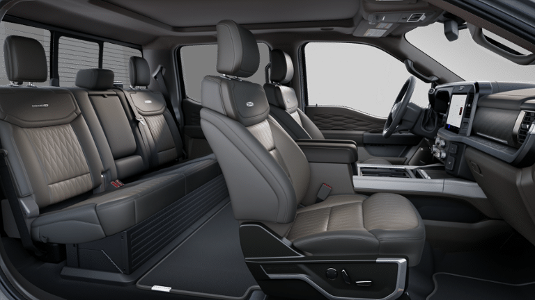 Equipped with Order Code 713A (Flow-Through Console, Radio: B&O Unleashed Sound System by Bang & Olufsen, and Unique Platinum Leather 40/Console/40 Seats), Platinum Plus Package (Illuminated Scuff Plates, Premium Luxury Leather-Wrapped Steering Wheel, Premium Venetian Leather Door Panel, Pro Power Onboard - 2kW, Satin Chrome Door Handles, Twin Panel Power Moonroof, Unique Satin Finish Grille, Unique Split Center Console Armrest, and Upfitter Switches (6)), 14 Speakers, 34 Gallon Fuel Tank, 4-Wheel Disc Brakes, 410 Amp Dual Alternators, ABS brakes, Adjustable pedals, Air Conditioning, Alloy wheels, AM/FM radio: SiriusXM with 360L, Auto High-beam Headlights, Auto tilt-away steering wheel, Auto-dimming Rear-View mirror, Automatic temperature control, Brake assist, Bumpers: body-color, Compass, Delay-off headlights, Driver door bin, Driver vanity mirror, Dual front impact airbags, Dual front side impact airbags, Electronic Stability Control, Emergency communication system: SYNC 4 911 Assist, Front anti-roll bar, Front Bucket Seats, Front Center Armrest, Front dual zone A/C, Front fog lights, Front License Plate Bracket, Front reading lights, Fully automatic headlights, Garage door transmitter, Heads-Up Display, Heated door mirrors, Heated front seats, Heated rear seats, Heated steering wheel, Illuminated entry, Leather steering wheel, Low tire pressure warning, Memory seat, Navigation System, Outside temperature display, Overhead airbag, Overhead console, Panic alarm, Passenger door bin, Passenger vanity mirror, Pedal memory, Power door mirrors, Power driver seat, Power passenger seat, Power steering, Power windows, Rain sensing wipers, Rapid-Heat Supplemental Cab Heater, Rear reading lights, Rear seat center armrest, Rear step bumper, Rear window defroster, Remote keyless entry, Security system, Speed control, Split folding rear seat, Steering wheel memory, Steering wheel mounted A/C controls, Steering wheel mounted audio controls, Tachometer, Telescoping steering wheel, Tilt steering wheel, Traction control, Trip computer, Turn signal indicator mirrors, Variably intermittent wipers, and Ventilated front seats. Price includes applicable rebates and excludes tax, title, license and $399 dealer fee: $1500 - Retail Customer Cash. Exp. 03/31/2026