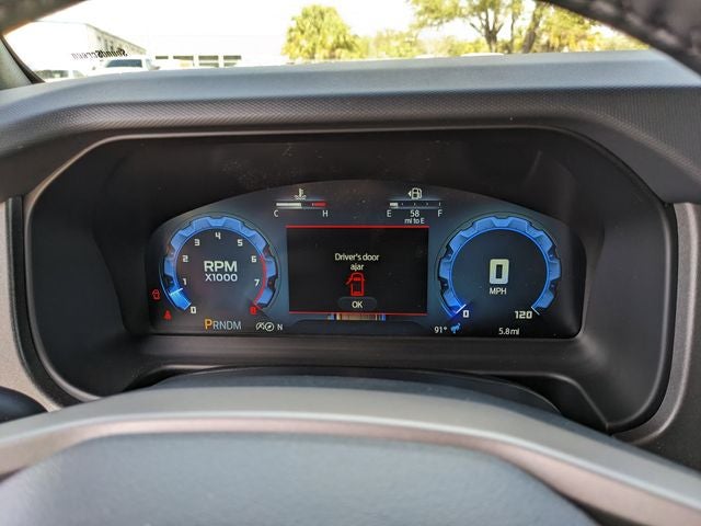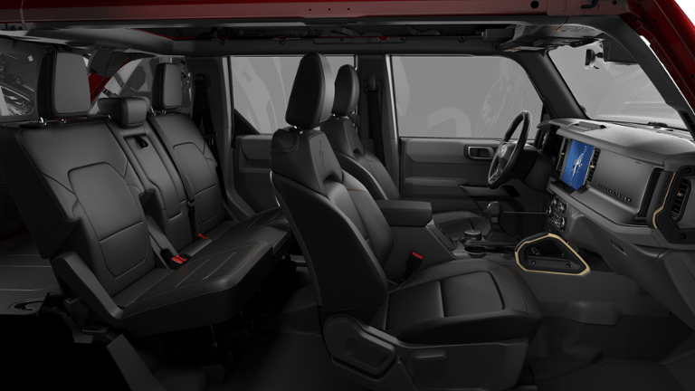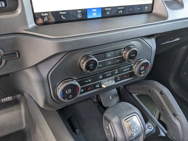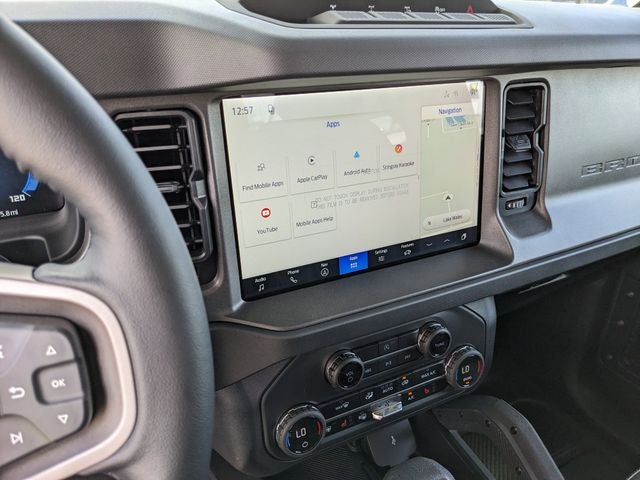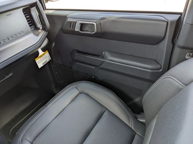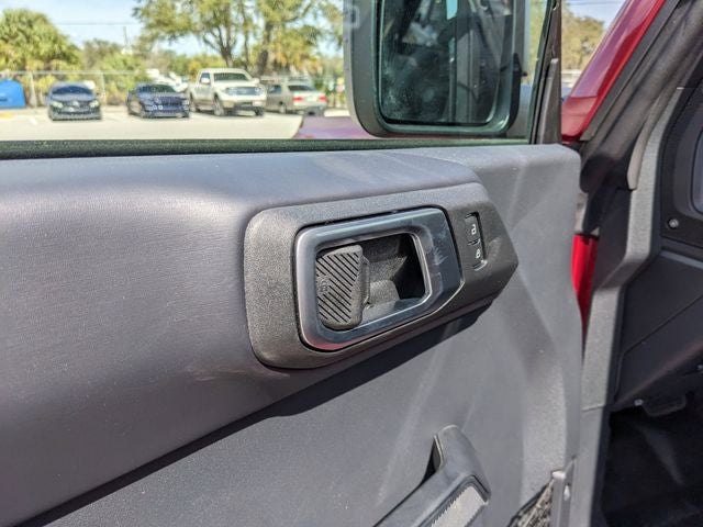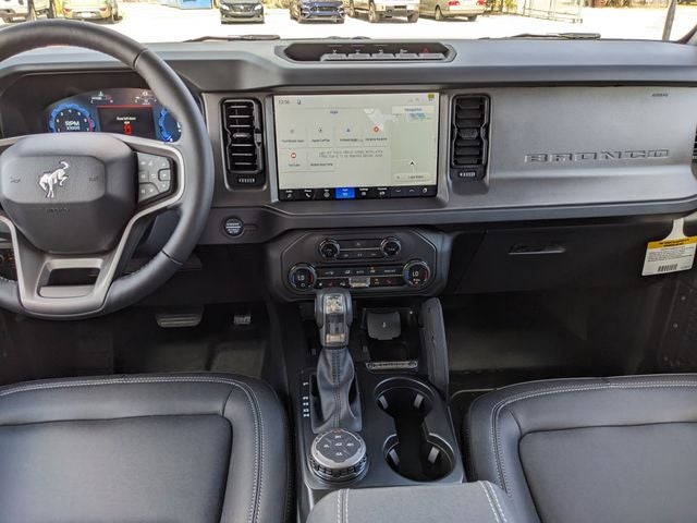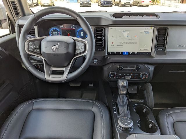 Equipped with Equipment Group 332A Mid Package (2-Door Intelligent Access with Lock/Unlock, AM/FM Stereo, Ambient Footwell Lighting, Connected Navigation, Driver and Front Passenger Illuminated Sliding Visor Vanity Mirrors, Dual Smart Charging USB Ports, Dual-Zone Electronic Automatic Temperature Control, Front Row Heated Seats, Heated Steering Wheel, Marine Grade Vinyl Heated Bucket Seats, Pro Power Onboard - 400W, Rear Parking Sensors, SiriusXM with 360L, SYNC 4, and Wheels: 17 Carbonized Gray-Painted Aluminum), Ford Connectivity Package (1-Year Included), Hard Top Sound Deadening Headliner, Rear-Window Defroster and Washer, Shadow Black Painted Hard Top, 4-Wheel Disc Brakes, 4.7 Axle Ratio, 7 Speakers, ABS brakes, Air Conditioning, Alloy wheels, AM/FM radio: SiriusXM with 360L, Auto High-Beam Headlamps, Auto High-beam Headlights, Auto-dimming Rear-View mirror, BLIS Blind Spot Information System, Brake assist, Compass, Delay-off headlights, Driver door bin, Driver vanity mirror, Dual front impact airbags, Dual front side impact airbags, Electronic Stability Control, Emergency communication system: 911 Assist, Exterior Parking Camera Rear, Front anti-roll bar, Front Bucket Seats, Front Center Armrest, Front fog lights, Front reading lights, Front wheel independent suspension, Fully automatic headlights, Heated door mirrors, Heated front seats, Illuminated entry, Integrated roll-over protection, Lane-Keeping System, Leather Shift Knob, Low tire pressure warning, Occupant sensing airbag, Outside temperature display, Overhead airbag, Overhead console, Panic alarm, Passenger door bin, Passenger vanity mirror, Power door mirrors, Power steering, Power windows, Pre-Collision Assist with Automatic Emergency Braking, Radio data system, Rear-View Camera, Remote keyless entry, Security system, Speed control, Split folding rear seat, Steering wheel mounted audio controls, Tachometer, Telescoping steering wheel, Tilt steering wheel, Traction control, Trip computer, Variably intermittent wipers, and Voltmeter.