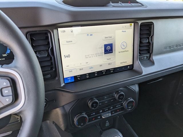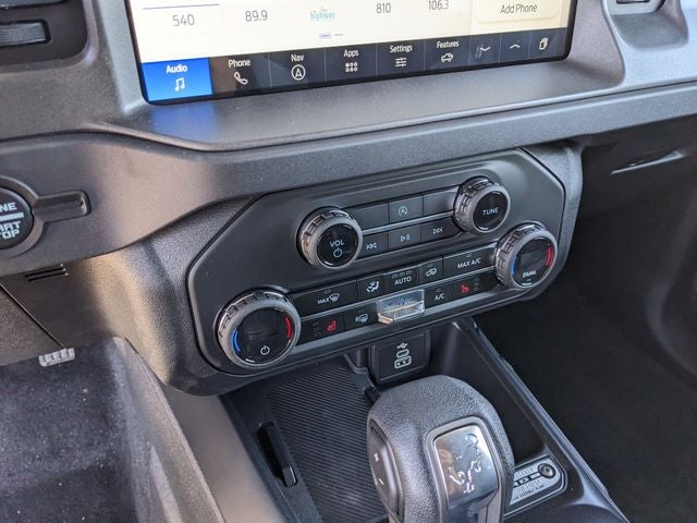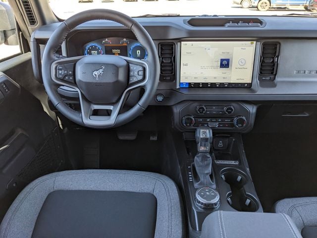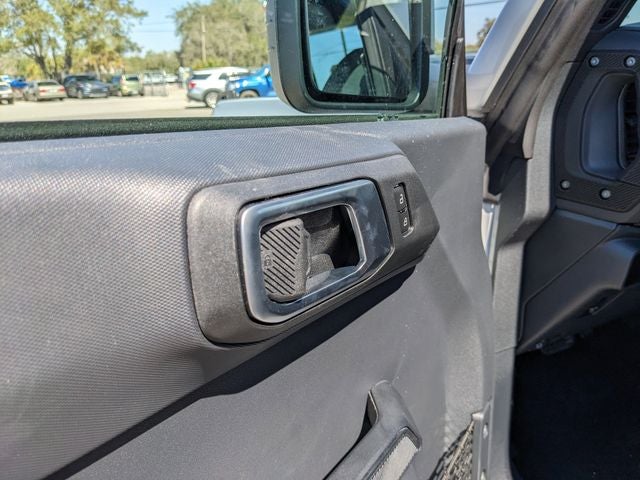 Equipped with Equipment Group 222A Mid Package (2-Door Intelligent Access with Lock/Unlock, AM/FM Stereo, Ambient Footwell Lighting, Cloth Bucket Seats, Connected Navigation, Driver and Front Passenger Illuminated Sliding Visor Vanity Mirrors, Dual Smart Charging USB Ports, Dual-Zone Electronic Automatic Temperature Control, Front Row Heated Seats, Pro Power Onboard - 400W, Rear Parking Sensors, SiriusXM with 360L, SYNC 4, and Wheels: 17 Carbonized Gray-Painted Aluminum), Ford Connectivity Package (1-Year Included), Carbonized Gray Molded-in-Color Hard Top, Rear-Window Defroster and Washer, 4-Wheel Disc Brakes, 4.46 Axle Ratio, 7 Speakers, ABS brakes, Air Conditioning, Alloy wheels, AM/FM radio: SiriusXM with 360L, Auto High-Beam Headlamps, Auto High-beam Headlights, BLIS Blind Spot Information System, Brake assist, Compass, Delay-off headlights, Driver door bin, Driver vanity mirror, Dual front impact airbags, Dual front side impact airbags, Electronic Stability Control, Emergency communication system: 911 Assist, Exterior Parking Camera Rear, Front anti-roll bar, Front Bucket Seats, Front Center Armrest, Front reading lights, Front wheel independent suspension, Fully automatic headlights, Heated door mirrors, Illuminated entry, Integrated roll-over protection, Lane-Keeping System, Low tire pressure warning, Occupant sensing airbag, Outside temperature display, Overhead airbag, Overhead console, Panic alarm, Passenger door bin, Passenger vanity mirror, Power door mirrors, Power steering, Power windows, Pre-Collision Assist with Automatic Emergency Braking, Radio data system, Rear-View Camera, Remote keyless entry, Security system, Speed control, Split folding rear seat, Steering wheel mounted audio controls, Tachometer, Telescoping steering wheel, Tilt steering wheel, Traction control, Trip computer, and Variably intermittent wipers.