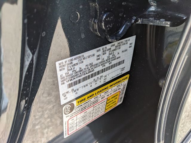 Equipped with Equipment Group 200A Select Package (3.31 Axle Ratio, Cloth Front Captain's Chairs, Ford Digital Experience, Radio: AM/FM Stereo with MP3 Capable, and SiriusXM with 360L), Ford Connectivity Package (1-Year Included), Wheels: 20 x 8.5 Bright Machined Aluminum, 3rd row seats: split-bench, 4-Wheel Disc Brakes, 6 Speakers, ABS brakes, Air Conditioning, Alloy wheels, AM/FM radio: SiriusXM with 360L, Apple CarPlay/Android Auto, Auto High-beam Headlights, Auto-dimming Rear-View mirror, Automatic temperature control, Brake assist, Bumpers: body-color, Compass, Delay-off headlights, Driver door bin, Driver vanity mirror, Dual front impact airbags, Dual front side impact airbags, Electronic Stability Control, Emergency communication system: 911 Assist, Exterior Parking Camera Rear, Four wheel independent suspension, Front anti-roll bar, Front Bucket Seats, Front Center Armrest, Front dual zone A/C, Front reading lights, Fully automatic headlights, Heated door mirrors, Illuminated entry, Low tire pressure warning, Navigation System, Occupant sensing airbag, Outside temperature display, Overhead airbag, Overhead console, Panic alarm, Passenger door bin, Passenger vanity mirror, Power door mirrors, Power driver seat, Power passenger seat, Power steering, Power windows, Radio data system, Rear air conditioning, Rear anti-roll bar, Rear reading lights, Rear window defroster, Rear window wiper, Reclining 3rd row seat, Remote keyless entry, Security system, Speed control, Speed-sensing steering, Speed-Sensitive Wipers, Split folding rear seat, Spoiler, Steering wheel mounted audio controls, Tachometer, Telescoping steering wheel, Tilt steering wheel, Traction control, Trip computer, Variably intermittent wipers, and Voltmeter.