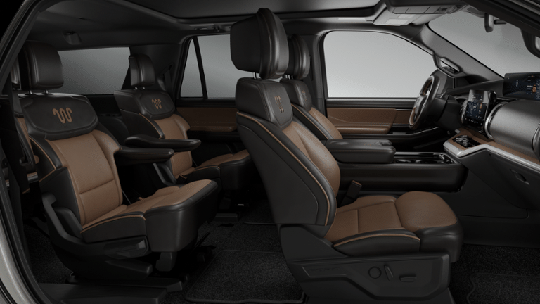 Equipped with Equipment Group 400A (3.73 Axle Ratio, Digital Device Holder, Heated/Ventilated Premium Del Rio Leather Front Captain's Chairs, and Wheels: 22 x 9.0 Diamond Cut Machined Face Aluminum), Ford Connectivity Package (1-Year Included), Power moonroof: Vista Roof, 22 Speakers, 3rd row seats: split-bench, 4-Wheel Disc Brakes, ABS brakes, Adaptive suspension, Adjustable pedals, Air Conditioning, Alloy wheels, AM/FM radio: SiriusXM with 360L, Apple CarPlay/Android Auto, Auto High-beam Headlights, Auto-dimming door mirrors, Auto-dimming Rear-View mirror, Automatic temperature control, Brake assist, Bumpers: body-color, Compass, Delay-off headlights, Driver door bin, Driver vanity mirror, Dual front impact airbags, Dual front side impact airbags, Electronic Stability Control, Emergency communication system: 911 Assist, Exterior Parking Camera Rear, Ford Digital Experience, Four wheel independent suspension, Front anti-roll bar, Front Bucket Seats, Front Center Armrest, Front dual zone A/C, Front reading lights, Fully automatic headlights, Garage door transmitter, Genuine wood dashboard insert, Genuine wood door panel insert, Heated door mirrors, Heated front seats, Heated rear seats, Heated steering wheel, Illuminated entry, Leather steering wheel, Low tire pressure warning, Memory seat, Navigation System, Occupant sensing airbag, Outside temperature display, Overhead airbag, Overhead console, Panic alarm, Passenger door bin, Passenger vanity mirror, Pedal memory, Power door mirrors, Power driver seat, Power passenger seat, Power steering, Power windows, Radio data system, Radio: B&O Unleashed Sound System by Bang & Olufsen, Rain sensing wipers, Rear air conditioning, Rear anti-roll bar, Rear reading lights, Rear window defroster, Rear window wiper, Reclining 3rd row seat, Remote keyless entry, Security system, SiriusXM with 360L, Speed control, Speed-sensing steering, Speed-Sensitive Wipers, Split folding rear seat, Spoiler, Steering wheel memory, Steering wheel mounted audio controls, Tachometer, Telescoping steering wheel, Tilt steering wheel, Traction control, Trip computer, Turn signal indicator mirrors, Variably intermittent wipers, Ventilated front seats, and Voltmeter.