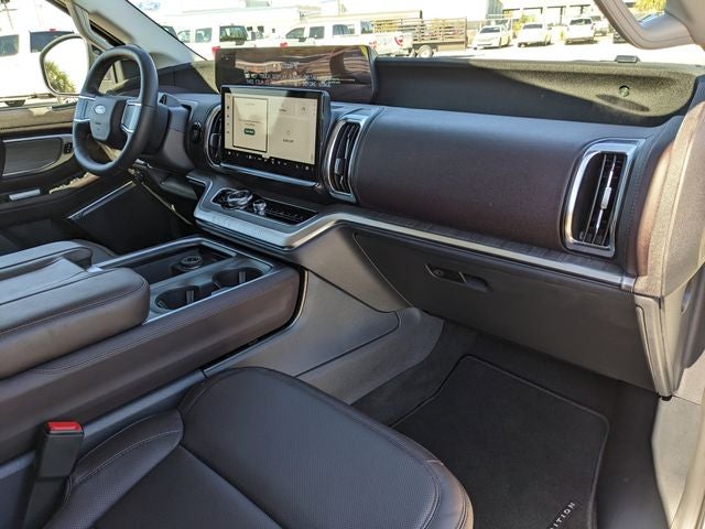 Equipped with Driver's Package (Radio: B&O Play Unleashed), Equipment Group 600A Standard Package (2nd Row Power-Folding Captain's Chairs, BlueCruise Equipped (90-Day Trial), 3.73 Axle Ratio, and Ford Digital Experience), Platinum Ultimate Interior Package, Platinum Ultimate Package (Engine Sound Enhancer, High Flow Exhaust System, Multicontour Active Motion Lthr Frnt Captains Chairs, Polished Stainless Steel Beltline Molding, Rear Seat Radio Controls, Rear Side Windows Laminated Glass, Signature Grille Lighting, Wheels: 24 x 9.5 Tarnished Dark Metallic, and Black Onyx Painted Power Deployable Running Boards), Ford Connectivity Package (1-Year Included), 2nd Row Power-Folding 40/20/40 Bench Seat, Power moonroof: Vista Roof, 10 Speakers, 3rd row seats: split-bench, 4-Wheel Disc Brakes, ABS brakes, Air Conditioning, Alloy wheels, AM/FM radio: SiriusXM with 360L, Apple CarPlay/Android Auto, Auto High-beam Headlights, Auto-dimming door mirrors, Auto-dimming Rear-View mirror, Automatic temperature control, Brake assist, Bumpers: body-color, Compass, Delay-off headlights, Driver door bin, Driver vanity mirror, Dual front impact airbags, Dual front side impact airbags, Electronic Stability Control, Emergency communication system: 911 Assist, Exterior Parking Camera Rear, Four wheel independent suspension, Front anti-roll bar, Front Bucket Seats, Front Center Armrest, Front dual zone A/C, Front License Plate Bracket, Front reading lights, Fully automatic headlights, Garage door transmitter, Genuine wood dashboard insert, Genuine wood door panel insert, Heated door mirrors, Heated front seats, Heated rear seats, Heated steering wheel, Illuminated entry, Intersection Assist, Leather steering wheel, Low tire pressure warning, Memory seat, Navigation System, Occupant sensing airbag, Outside temperature display, Overhead airbag, Overhead console, Panic alarm, Passenger door bin, Passenger vanity mirror, Power door mirrors, Power driver seat, Power passenger seat, Power steering, Power windows, Radio data system, Rain sensing wipers, Rear air conditioning, Rear anti-roll bar, Rear reading lights, Rear window defroster, Rear window wiper, Reclining 3rd row seat, Remote keyless entry, Security system, Speed control, Speed-sensing steering, Speed-Sensitive Wipers, Split folding rear seat, Spoiler, Steering wheel memory, Steering wheel mounted audio controls, Tachometer, Telescoping steering wheel, Tilt steering wheel, Traction control, Trip computer, Turn signal indicator mirrors, Variably intermittent wipers, Ventilated front seats, and Voltmeter.