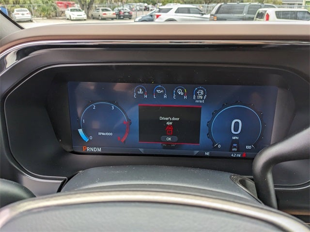 Equipped with Order Code 700A (Wheels: 20 Bright Machined Aluminum, Flow-Through Console, Radio: B&O Unleashed Sound System by Bang & Olufsen, and Unique King Ranch Leather 40/Console/40 Seats), Ford Connectivity Package (1-Year Included), High Capacity 11.6 Axle Upgrade Package, Internet access capable: 5G Modem - Ford Connectivity Package, All-Weather Floor Mats, Power-Deployable Running Boards, Twin Panel Power Moonroof, 14 Speakers, 34 Gallon Fuel Tank, 4-Wheel Disc Brakes, 410 Amp Dual Alternators, ABS brakes, Adjustable pedals, Air Conditioning, Alloy wheels, AM/FM radio: SiriusXM with 360L, Auto High-beam Headlights, Auto tilt-away steering wheel, Auto-dimming Rear-View mirror, Automatic temperature control, Brake assist, Compass, Delay-off headlights, Driver door bin, Driver vanity mirror, Dual front impact airbags, Dual front side impact airbags, Electronic Stability Control, Emergency communication system: SYNC 4 911 Assist, Front anti-roll bar, Front Bucket Seats, Front Center Armrest, Front dual zone A/C, Front fog lights, Front License Plate Bracket, Front reading lights, Fully automatic headlights, Garage door transmitter, Heads-Up Display, Heated door mirrors, Heated front seats, Heated rear seats, Heated steering wheel, Illuminated entry, Leather steering wheel, Low tire pressure warning, Memory seat, Navigation system: Connected Navigation, Outside temperature display, Overhead airbag, Overhead console, Panic alarm, Passenger door bin, Passenger vanity mirror, Pedal memory, Power door mirrors, Power driver seat, Power passenger seat, Power steering, Power windows, Rain sensing wipers, Rear reading lights, Rear seat center armrest, Rear step bumper, Rear window defroster, Remote keyless entry, Security system, Speed control, Split folding rear seat, Steering wheel memory, Steering wheel mounted A/C controls, Steering wheel mounted audio controls, Tachometer, Telescoping steering wheel, Tilt steering wheel, Traction control, Trip computer, Turn signal indicator mirrors, Variably intermittent wipers, and Ventilated front seats.