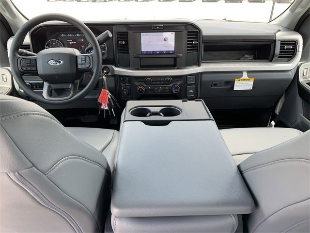 Equipped with Order Code 600A (HD Vinyl 40/20/40 Split Bench Seat, 17 Argent Painted Steel Wheels, and SYNC 4), Ford Connectivity Package (1-Year Included), Internet access capable: 5G Modem - Ford Connectivity Package, LED Box Lighting, Platform Running Boards, 34 Gallon Fuel Tank, 4-Wheel Disc Brakes, 6 Speakers, ABS brakes, Air Conditioning, AM/FM radio, Brake assist, Compass, Delay-off headlights, Dual AGM 68 AH Battery, Dual front impact airbags, Dual front side impact airbags, Electronic Stability Control, Emergency communication system: SYNC 4 911 Assist, Exterior Parking Camera Rear, Front anti-roll bar, Front Center Armrest w/Storage, Front License Plate Bracket, Front reading lights, Fully automatic headlights, Heated door mirrors, Illuminated entry, Low tire pressure warning, Outside temperature display, Overhead airbag, Overhead console, Panic alarm, Passenger vanity mirror, Power door mirrors, Power steering, Power windows, Rear reading lights, Rear step bumper, Remote keyless entry, Security system, Speed control, Split folding rear seat, Steering wheel mounted audio controls, Tachometer, Telescoping steering wheel, Tilt steering wheel, Traction control, Trip computer, Turn signal indicator mirrors, and Variably intermittent wipers.
