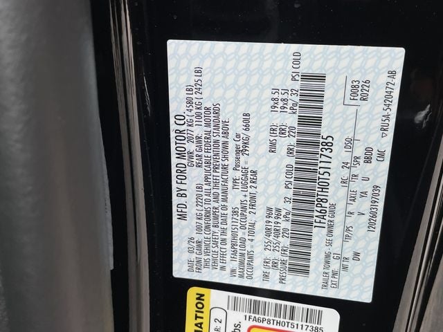 Equipped with Equipment Group 100A Standard Package (AM/FM Stereo, Cloth Bucket Seats, SYNC 4, and Wheels: 18 x 8 Painted Shadow Silver Cast Aluminum), ABS brakes, Active Valve Performance Exhaust, Alloy wheels, Compass, Electronic Stability Control, Front dual zone A/C, Illuminated entry, Low tire pressure warning, Remote keyless entry, Traction control, Wheels: 19 x 8.5 Premier Polished Aluminum, 4-Wheel Disc Brakes, 6 Speakers, Air Conditioning, AM/FM radio, Auto High-beam Headlights, Automatic temperature control, Brake assist, Bumpers: body-color, Delay-off headlights, Driver door bin, Driver vanity mirror, Dual front impact airbags, Dual front side impact airbags, Emergency communication system: 911 Assist, Exterior Parking Camera Rear, Four wheel independent suspension, Front anti-roll bar, Front Bucket Seats, Front Center Armrest, Front reading lights, Fully automatic headlights, Knee airbag, Leather Shift Knob, Occupant sensing airbag, Outside temperature display, Overhead airbag, Overhead console, Panic alarm, Passenger door bin, Passenger vanity mirror, Power door mirrors, Power steering, Power windows, Radio data system, Rain sensing wipers, Rear anti-roll bar, Rear Parking Sensors, Rear window defroster, Speed control, Speed-sensing steering, Speed-Sensitive Wipers, Split folding rear seat, Sport steering wheel, Steering wheel mounted audio controls, Tachometer, Telescoping steering wheel, Tilt steering wheel, Trip computer, Variably intermittent wipers, and Voltmeter. Price includes applicable rebates and excludes tax, title, license and $399 dealer fee: $1500 - Retail Customer Cash. Exp. 04/30/2026