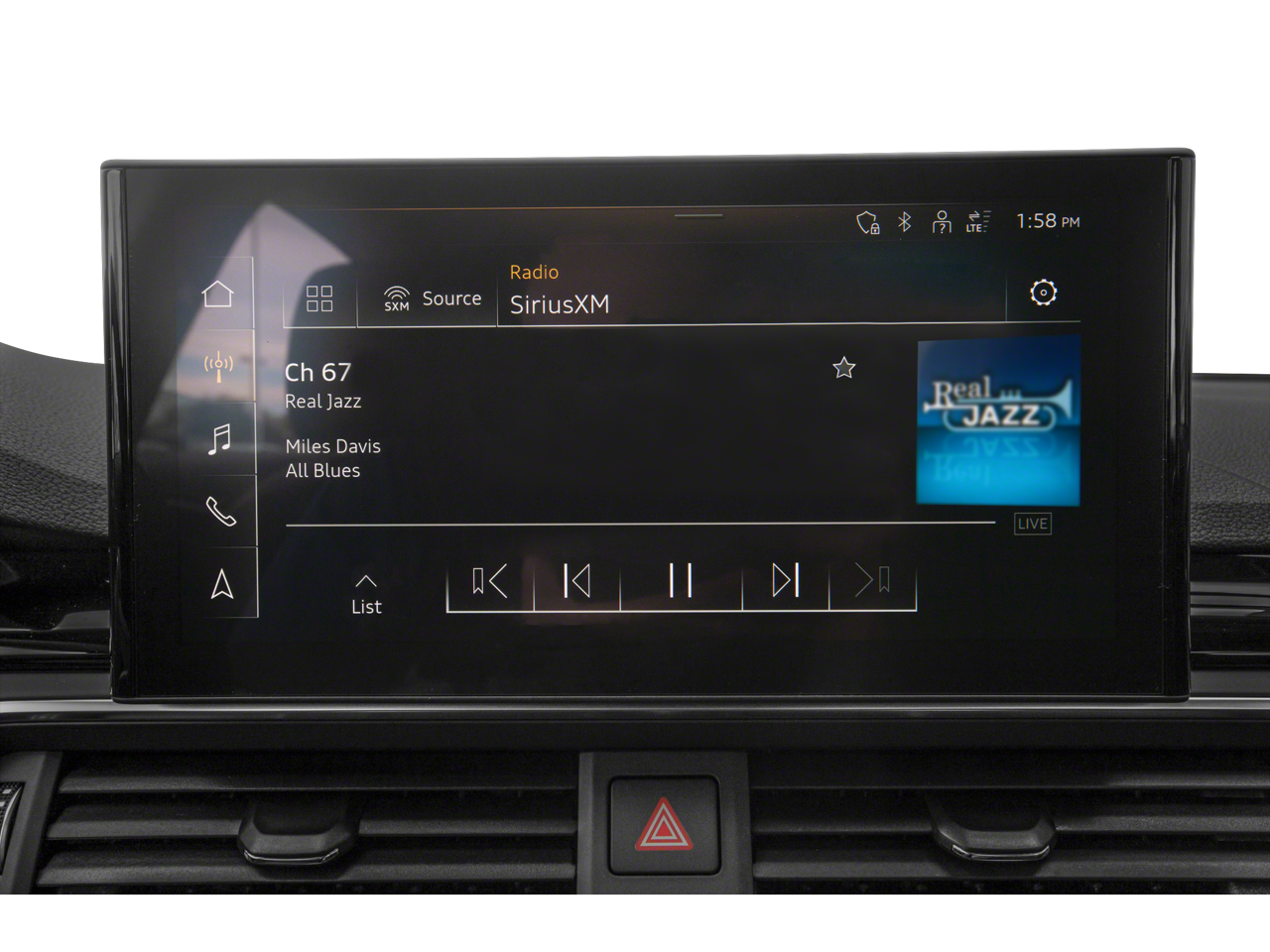 Equipped with 10 Speakers, 4-Wheel Disc Brakes, ABS brakes, Air Conditioning, Alloy wheels, AM/FM radio, Anti-whiplash front head restraints, Audi smartphone interface (Apple CarPlay/Android Auto), Auto High-beam Headlights, Auto-dimming Rear-View mirror, Automatic temperature control, Brake assist, Bumpers: body-color, Compass, Delay-off headlights, Driver door bin, Driver vanity mirror, Dual front impact airbags, Dual front side impact airbags, Electronic Stability Control, Emergency communication system: Audi connect CARE, Exterior Parking Camera Rear, Four wheel independent suspension, Front anti-roll bar, Front Bucket Seats, Front Center Armrest, Front dual zone A/C, Front fog lights, Front reading lights, Garage door transmitter: HomeLink, Genuine wood dashboard insert, Genuine wood door panel insert, Heated door mirrors, Heated Front Bucket Seats, Heated front seats, Illuminated entry, Knee airbag, Leather Seating Surfaces, Leather Shift Knob, Leather steering wheel, Low tire pressure warning, Occupant sensing airbag, Outside temperature display, Overhead airbag, Overhead console, Panic alarm, Passenger door bin, Passenger vanity mirror, Power door mirrors, Power driver seat, Power moonroof, Power passenger seat, Power steering, Power windows, Radio data system, Radio: Audi Sound System, Rain sensing wipers, Rear air conditioning, Rear anti-roll bar, Rear reading lights, Rear seat center armrest, Rear window defroster, Remote keyless entry, Speed control, Speed-sensing steering, Speed-Sensitive Wipers, Split folding rear seat, Steering wheel mounted audio controls, Tachometer, Telescoping steering wheel, Tilt steering wheel, Traction control, Trip computer, Turn signal indicator mirrors, Variably intermittent wipers, and Wheels: 17 10-Spoke Design Forged.