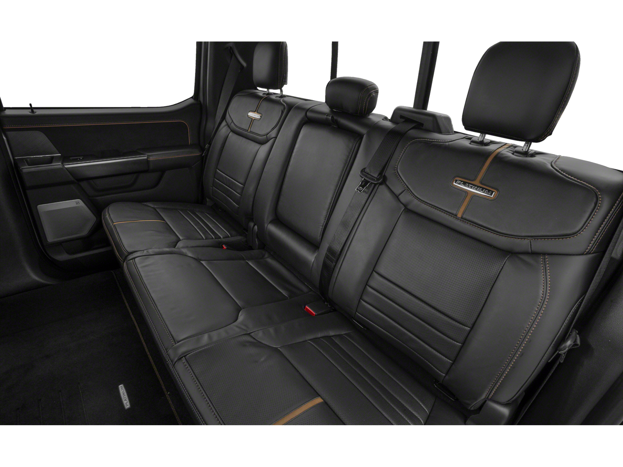 Equipped with Bed Utility Package (BoxLink, LED Box Lighting, Power Tailgate, and Tailgate Step w/Tailgate Work Surface), Equipment Group 701A High (Radio: B&O Unleashed Sound System by Bang & Olufsen), Ford Co-Pilot360 Active 2.0 (Active Park Assist 2.0 and BlueCruise), Trailer Tow Package (Class IV Trailer Hitch Receiver, Integrated Trailer Brake Controller, and Pro Trailer Backup Assist), 20 Polished Aluminum Wheels, 360 Degree Camera, 4-Wheel Disc Brakes, 8 Speakers, ABS brakes, Active Park Assist 2.0 Removal, Adaptive Steering, Adjustable pedals, Air Conditioning, Alloy wheels, AM/FM radio: SiriusXM with 360L, Auto High-beam Headlights, Auto Start-Stop Removal, Auto tilt-away steering wheel, Auto-dimming door mirrors, Auto-dimming Rear-View mirror, Automatic temperature control, Brake assist, Bumpers: body-color, Compass, Delay-off headlights, Driver door bin, Driver vanity mirror, Dual front impact airbags, Dual front side impact airbags, Electronic Stability Control, Emergency communication system: SYNC 4 911 Assist, Exterior Parking Camera Rear, Front anti-roll bar, Front Bucket Seats, Front Center Armrest, Front dual zone A/C, Front fog lights, Front reading lights, Front wheel independent suspension, Fully automatic headlights, Garage door transmitter, Heated door mirrors, Heated front seats, Heated rear seats, Heated steering wheel, Illuminated entry, Interior Work Surface, LED Sideview Mirror Spotlights, Low tire pressure warning, Memory seat, Occupant sensing airbag, Outside temperature display, Overhead airbag, Overhead console, Panic alarm, Passenger door bin, Passenger vanity mirror, Pedal memory, Power door mirrors, Power driver seat, Power passenger seat, Power steering, Power windows, Pro Power Onboard - 7.2KW, Radio data system, Radio: B&O Sound System by Bang & Olufsen, Rain sensing wipers, Rear reading lights, Rear seat center armrest, Rear step bumper, Rear window defroster, Remote keyless entry, Security system, Speed control, Speed-sensing steering, Split folding rear seat, Steering wheel memory, Steering wheel mounted audio controls, SYNC 4 w/Enhanced Voice Recognition, Tachometer, Telescoping steering wheel, Tilt steering wheel, Traction control, Trip computer, Turn signal indicator mirrors, Twin Panel Moonroof, Unique Multi-Contour Carmelo Leather Bucket Seats, Unique Multi-Contour Leather Bucket Seats, Variably intermittent wipers, Ventilated front seats, and Voltmeter.