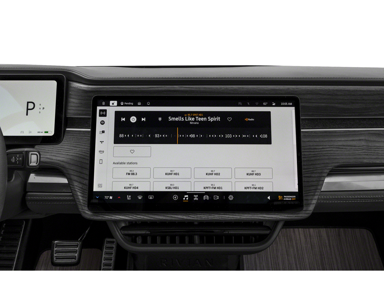 - Radio: Rivian Standard Audio -inc: FM/HD radio, 15.6" infotainment screen, Alexa vehicle command, hands-free Bluetooth® interface, Spotify and TuneIn